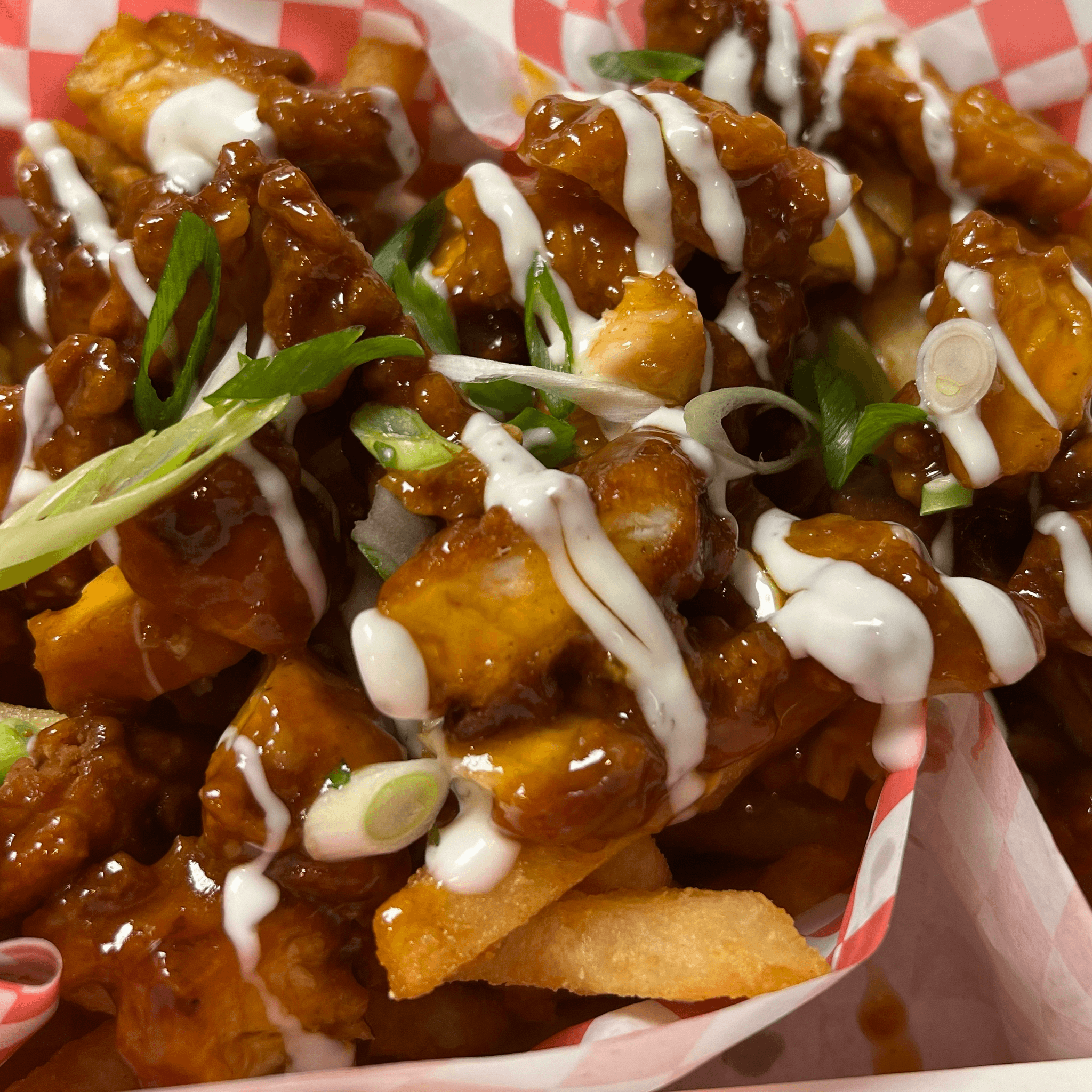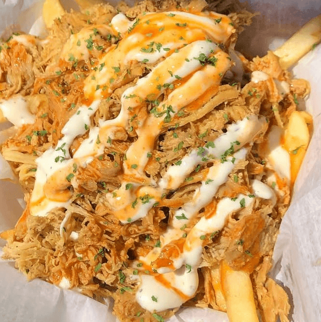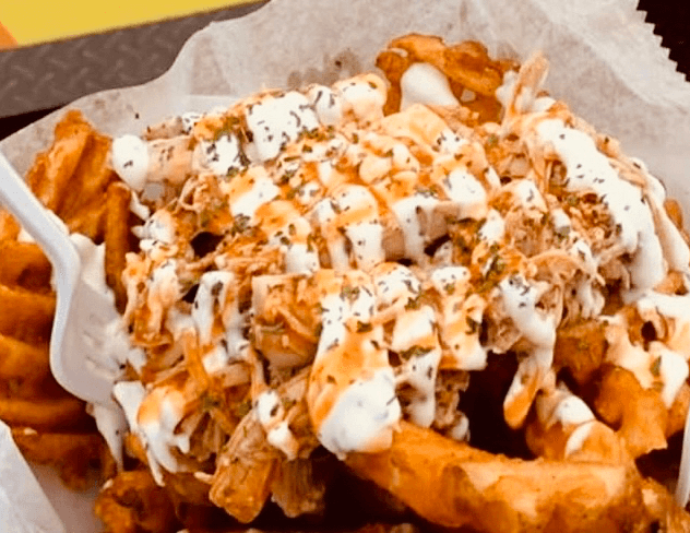 Hot Crispy Waffle Fries With Juicy Pulled Chicken And Your Choice Of Sauce.