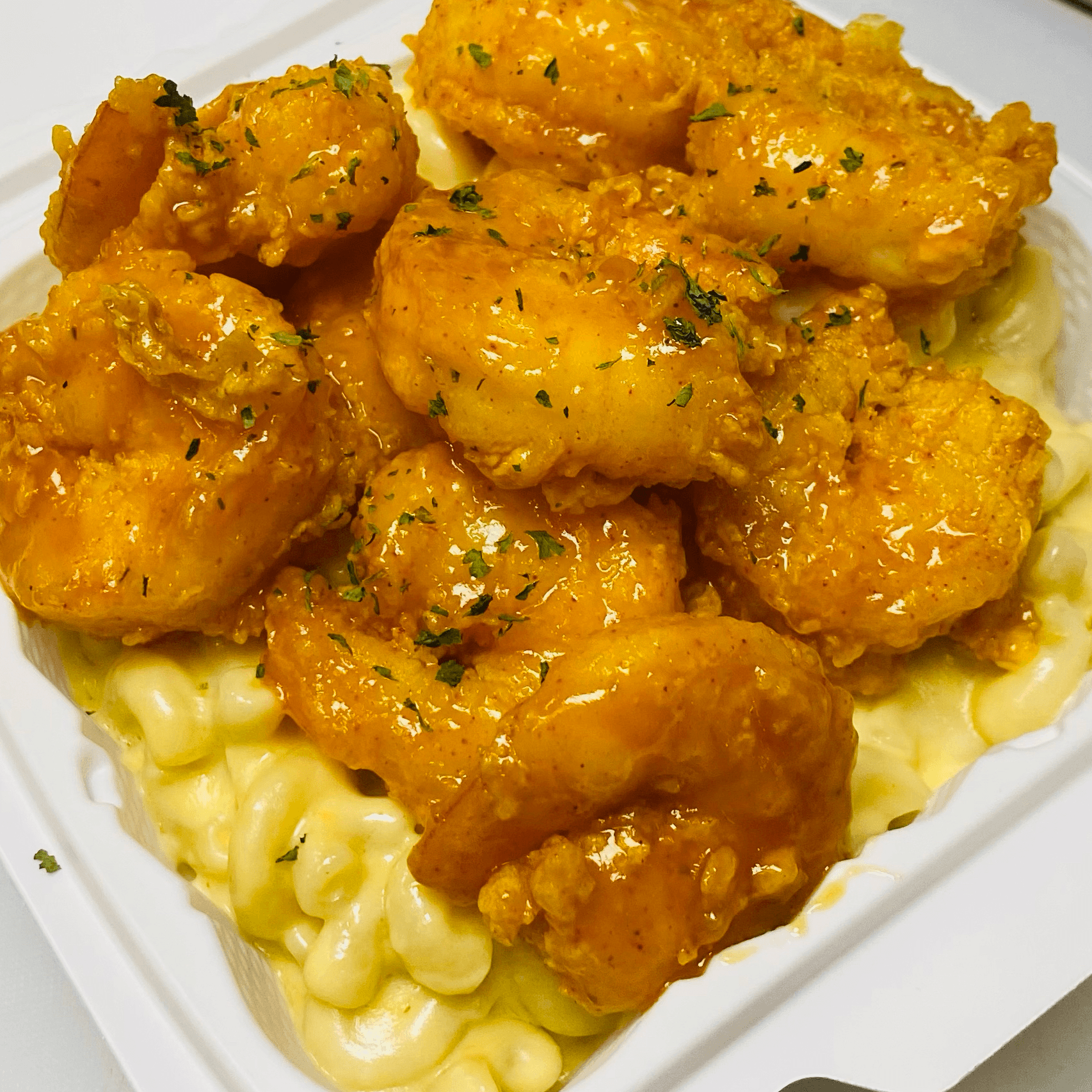 Creamy Mac Topped With Golden Crispy Chicken. Add Your Favorite Wing Sauce.