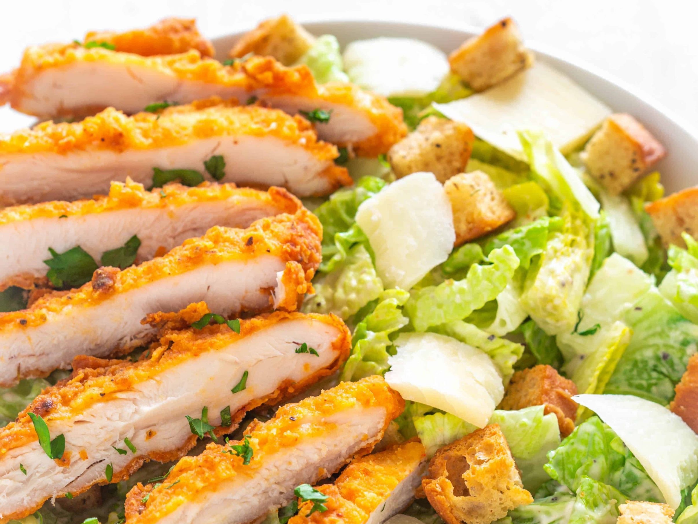 Crisp Romaine Tossed In Caesar Dressing, Topped With Golden Crispy Slices Of Chicken And Parmesan.