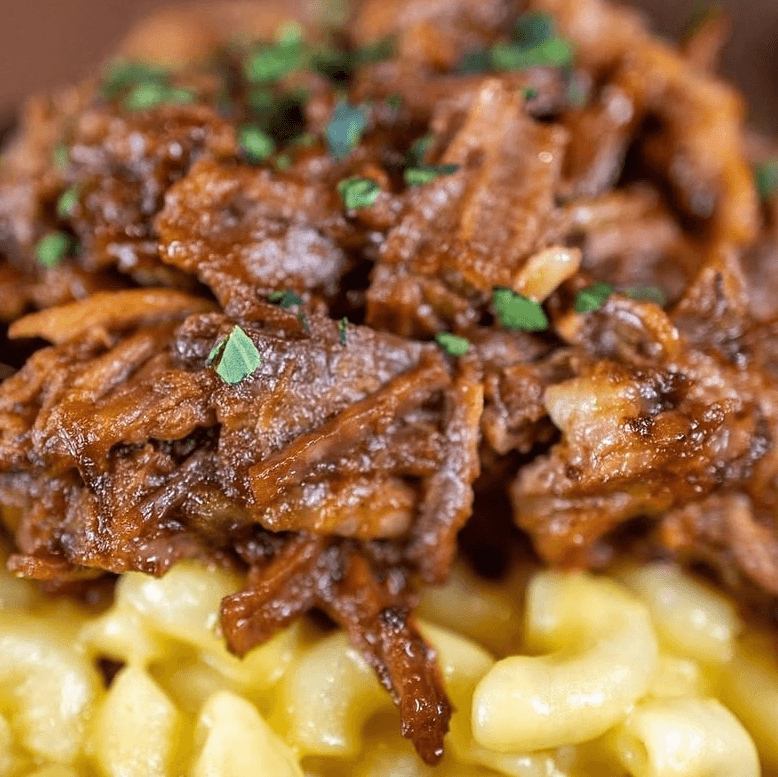 Comforting Mac & Cheese Loaded With Savory Pulled Brisket And A Drizzle Of BBQ Sauce.