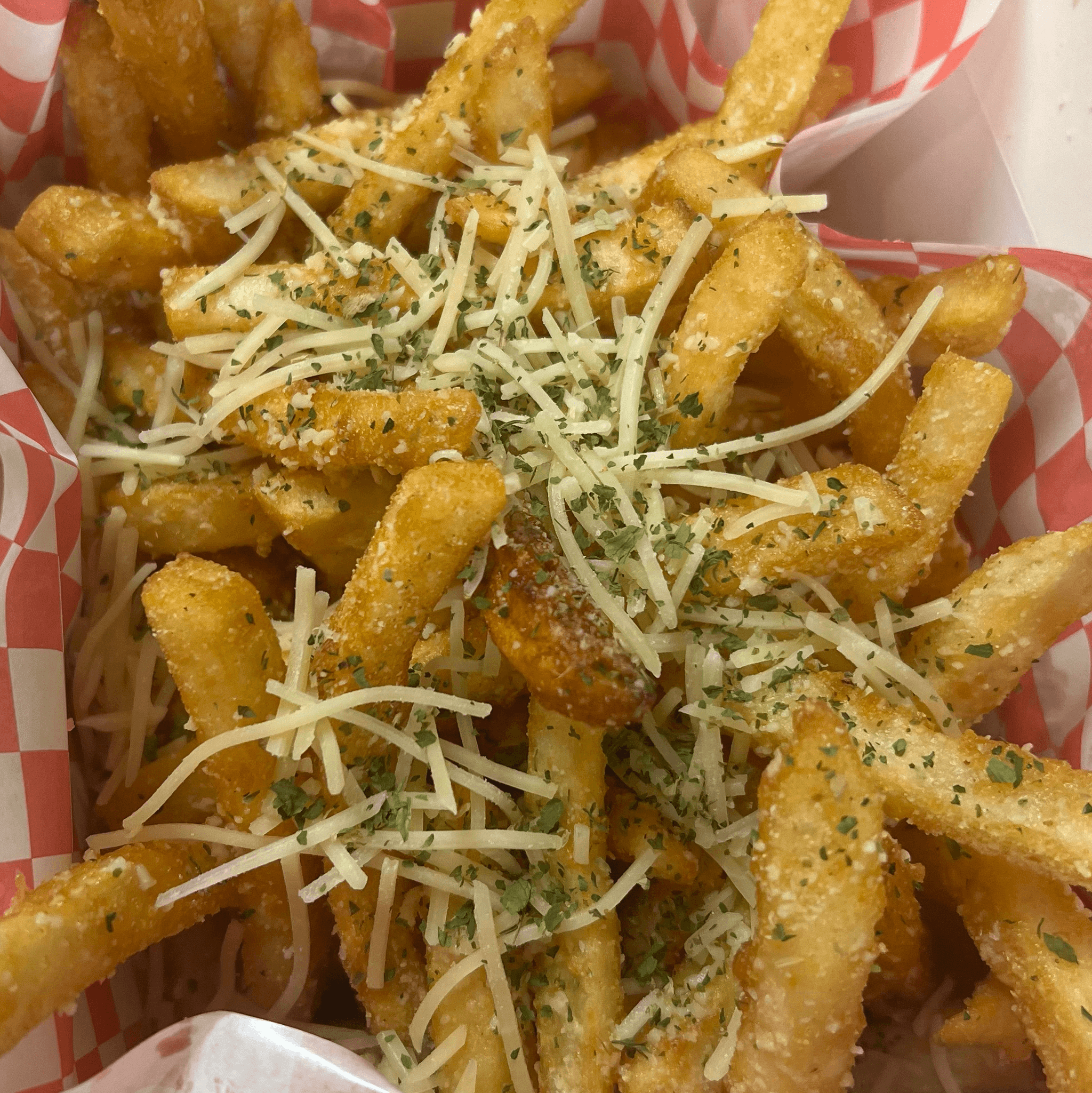 Hot Crispy Waffle Fries Coated In Savory Garlic Parm Sauce And Sprinkled With Fresh Parmesan.