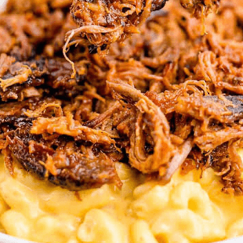 Comforting Mac & Cheese Loaded With Slow Cooked Pulled Pork And A Drizzle Of BBQ Sauce.